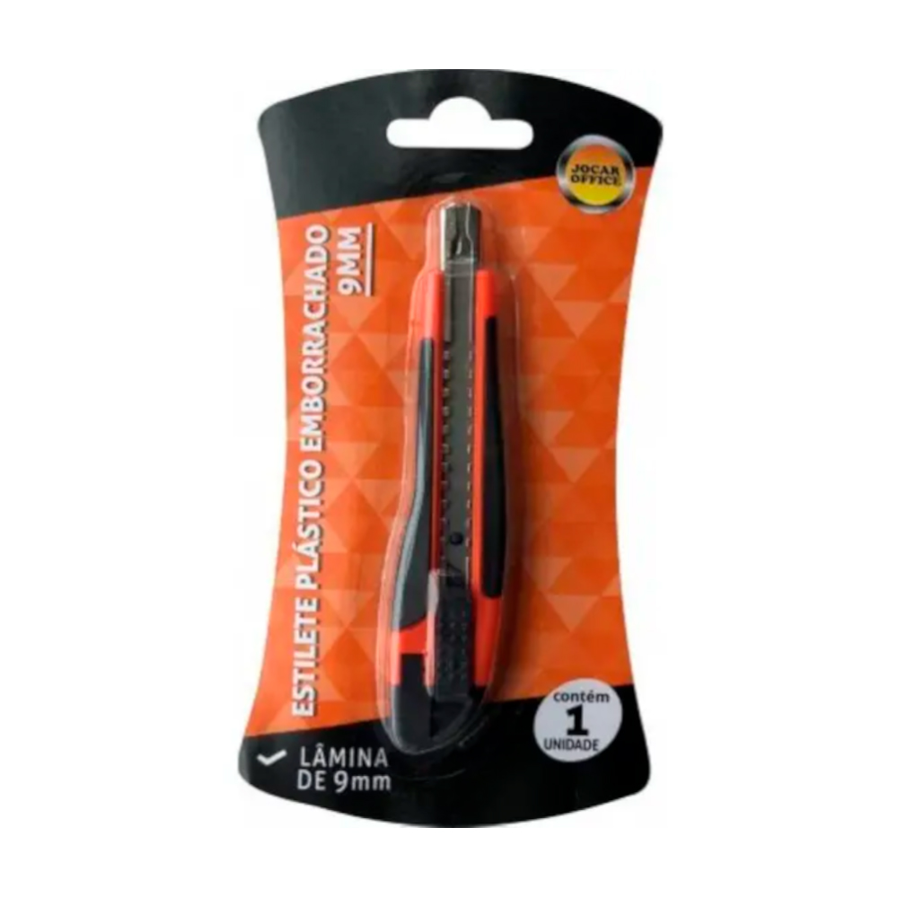 Estilete de 9mm com lâmina retrátil e corpo plástico colorido, indicado para cortes precisos em papel, EVA e outros materiais.