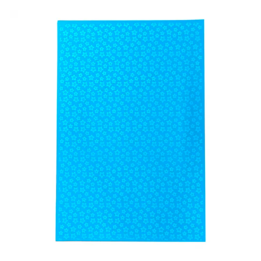 Folha de EVA estampada com padrão de estrelinhas azuis e pretas, perfeita para artesanato, decoração e trabalhos escolares.