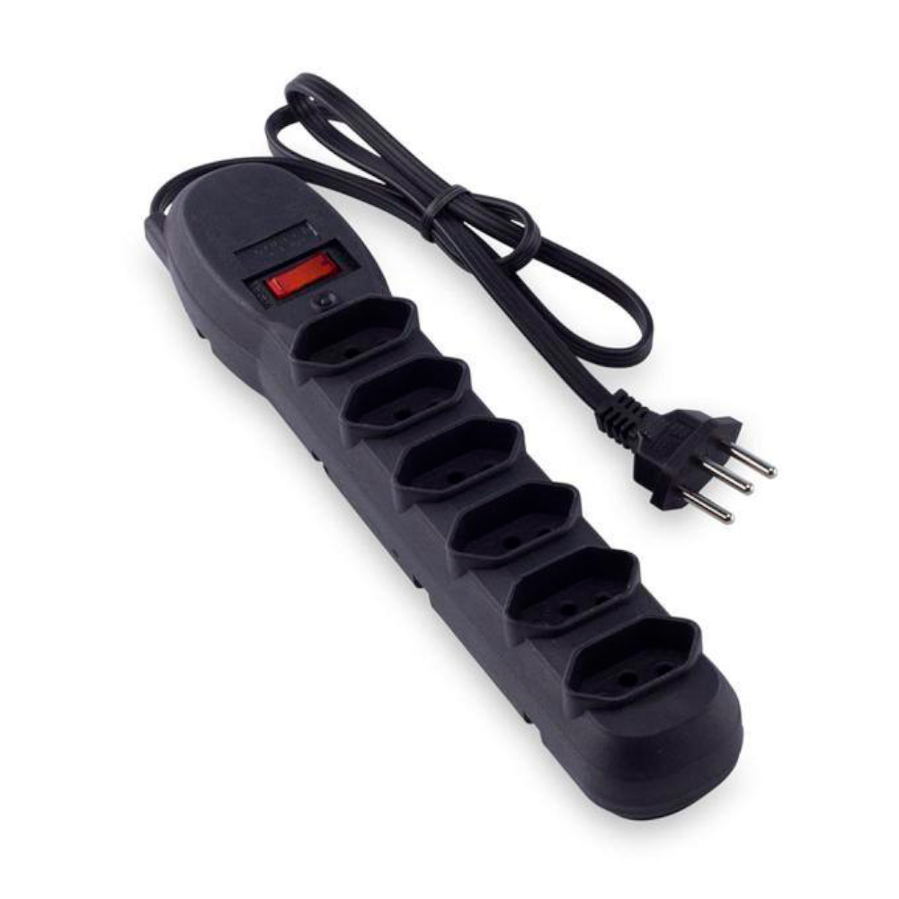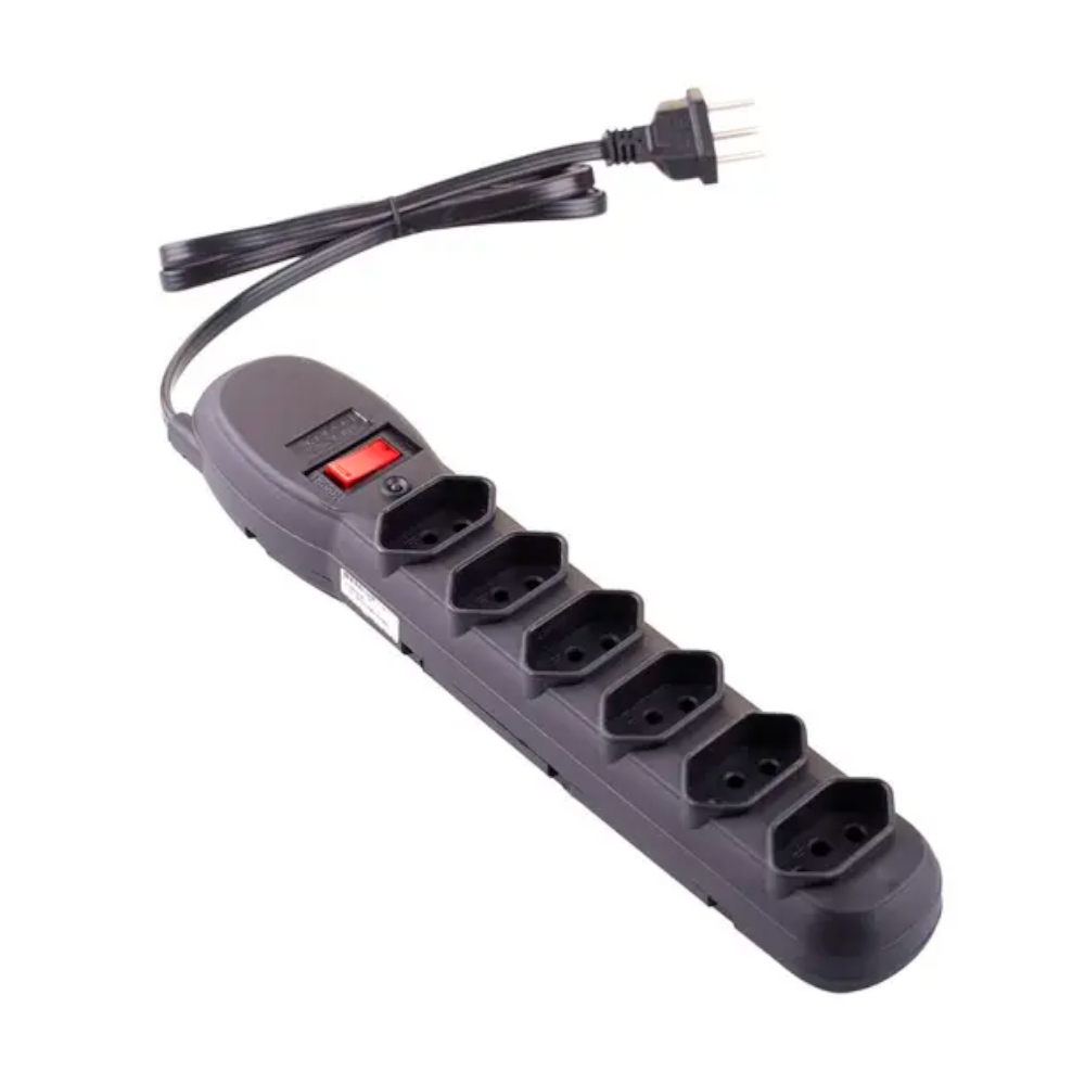 Protetor elétrico com seis tomadas e fusível de segurança, ideal para conectar diversos aparelhos simultaneamente. Possui chave liga/desliga e proteção contra surtos elétricos.