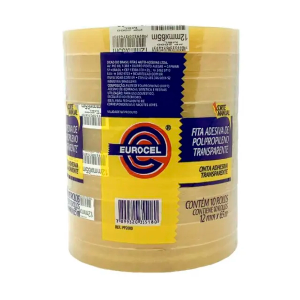 Fita adesiva transparente com 12mm de largura e 65m de comprimento. Versátil, pode ser usada para embalagens, colagens e reparos.