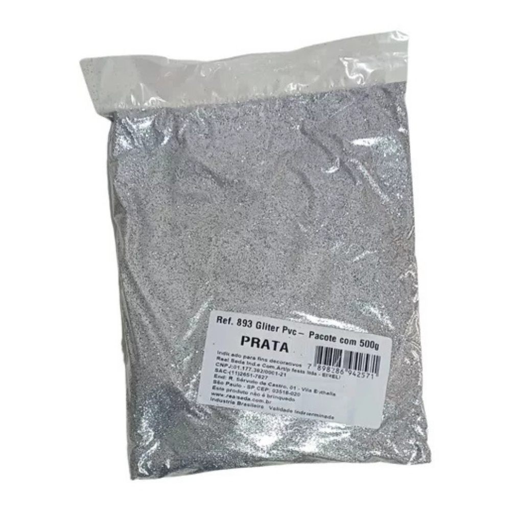 Glitter metálico prateado, em embalagem de 500g. Indicado para trabalhos artísticos e decorações, com brilho intenso e aplicação fácil.