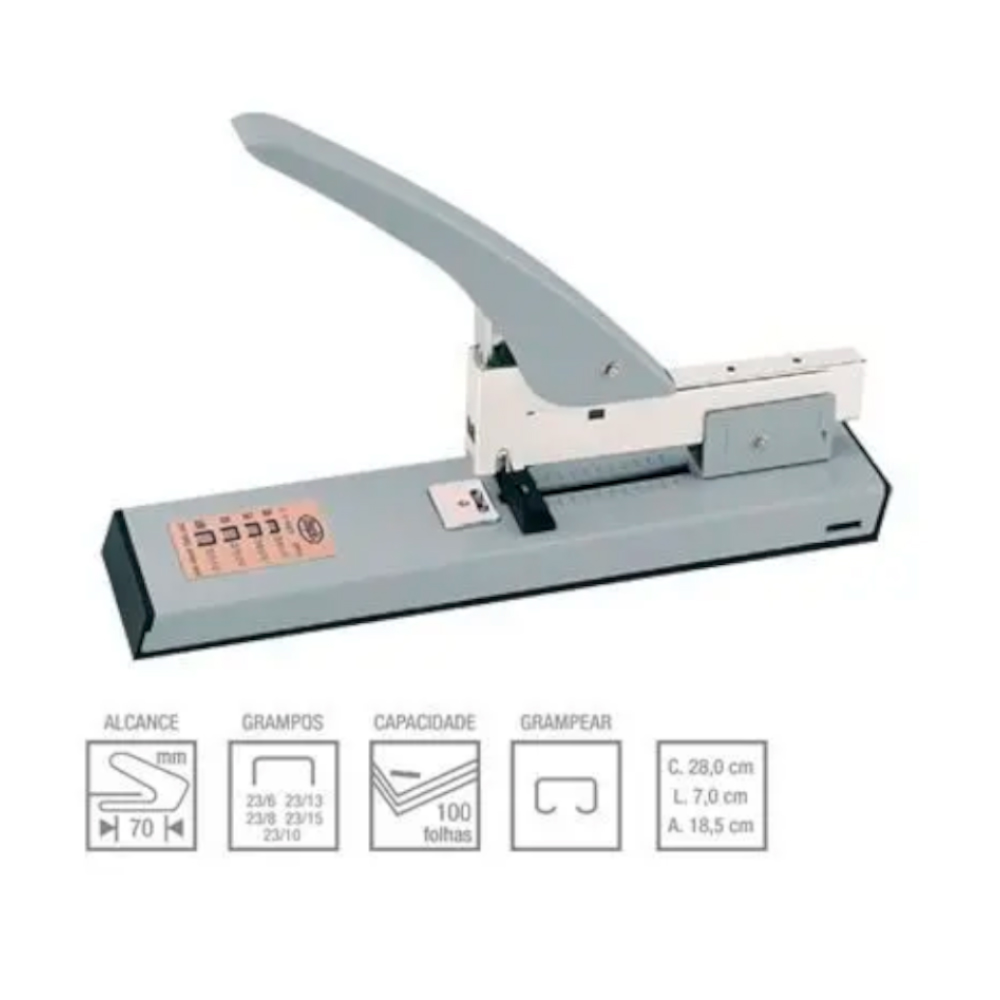 Ferramenta robusta para uso intenso em escritório, encadernação e papelaria. Oferece precisão e eficiência ao grampear diversos tipos de papel.
