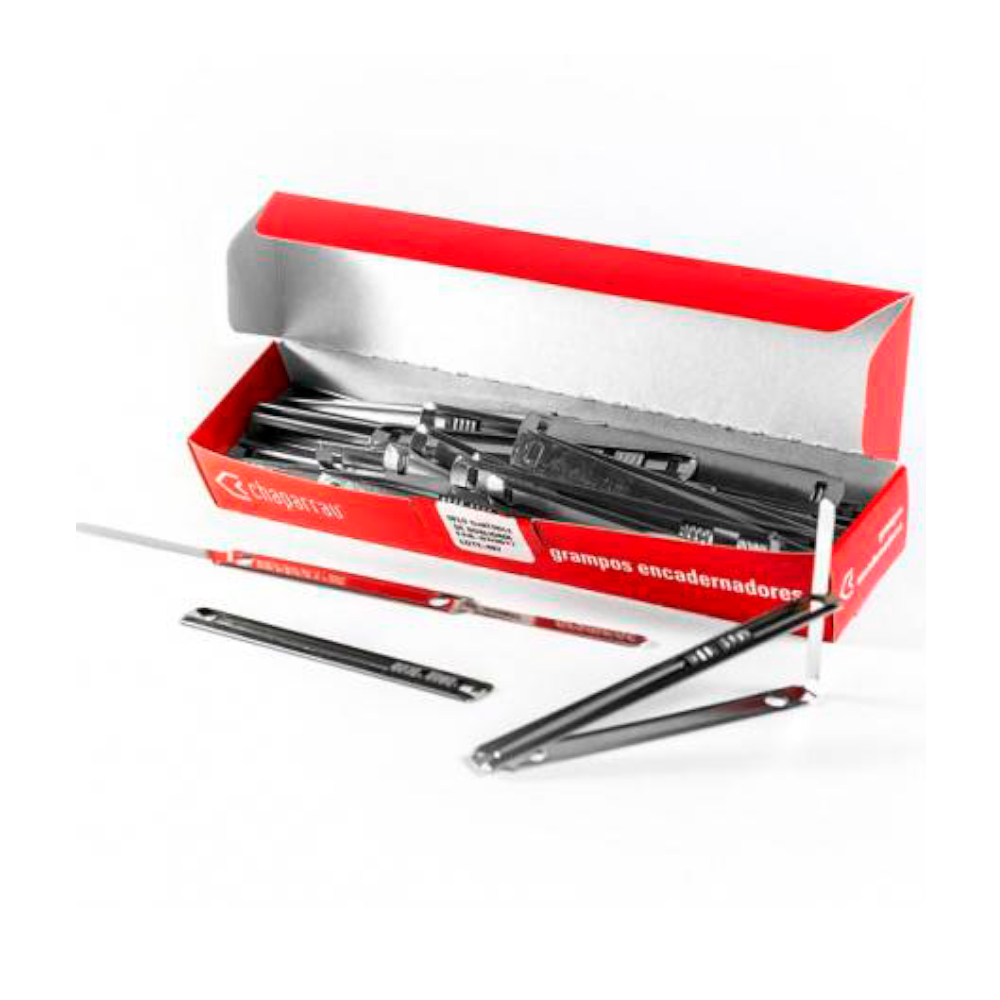 Grampo metálico para fixação de documentos, utilizado em arquivos e fichários.