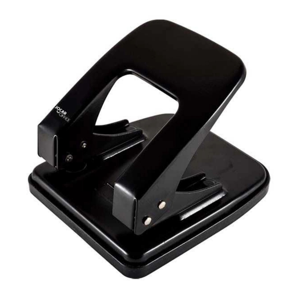 Perfurador metálico da marca Jocar Office, com capacidade para perfurar até 30 folhas simultaneamente. Equipado com guia de ajuste e estrutura reforçada, oferece precisão e praticidade na organização de documentos.