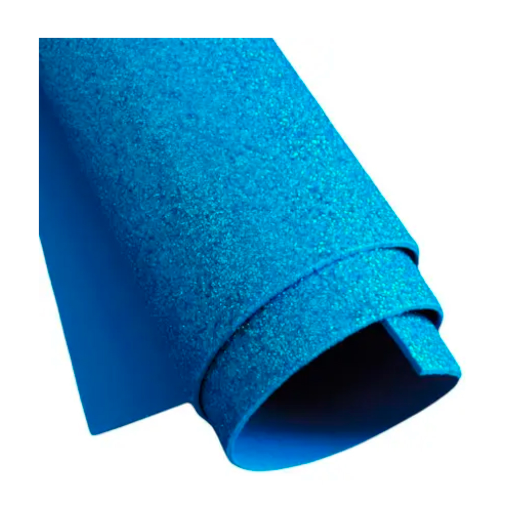 Folha de EVA com brilho suave e tom azul claro, ideal para scrapbook e projetos decorativos.