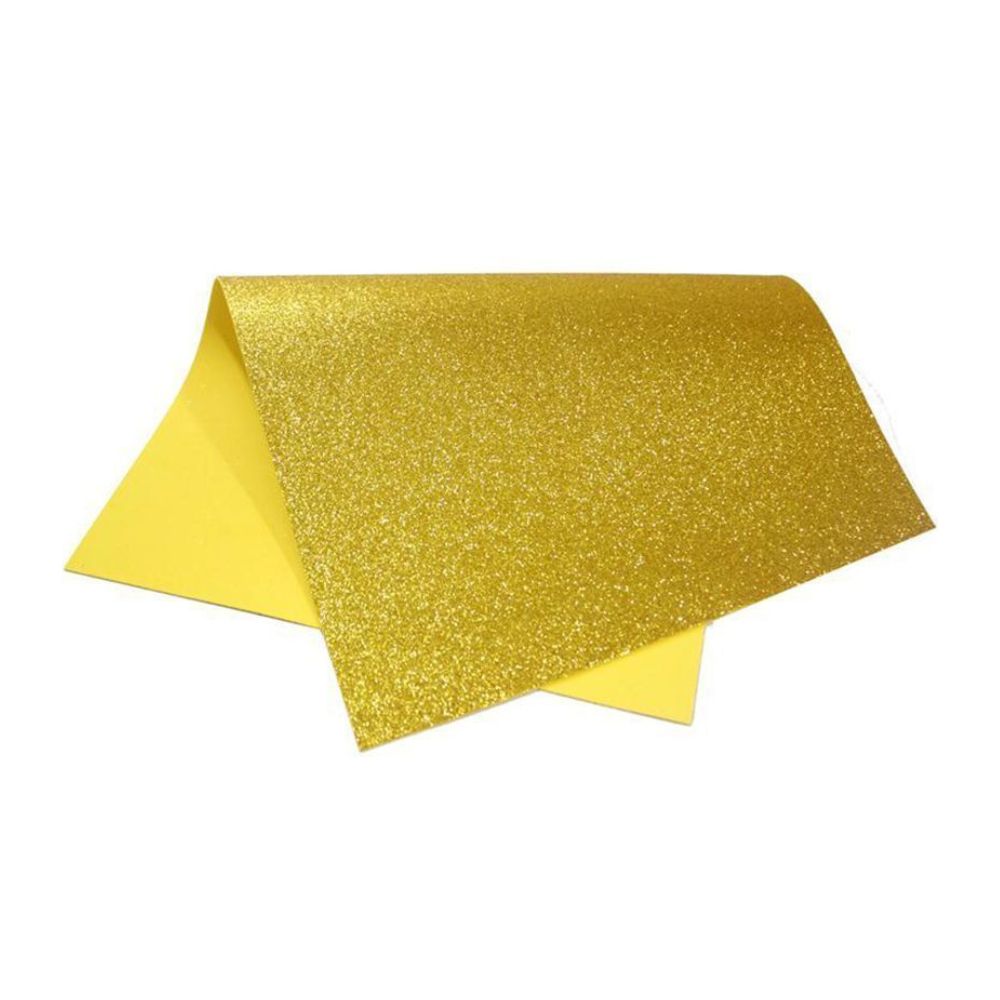 Placa de EVA glitter dourado, perfeita para enfeites, letras decorativas e detalhes brilhantes em trabalhos manuais.