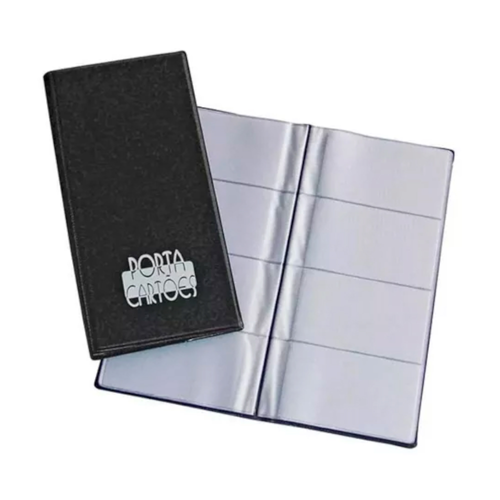Pasta organizadora com capacidade para 80 cartões, ideal para armazenar cartões de visita de forma prática e segura.