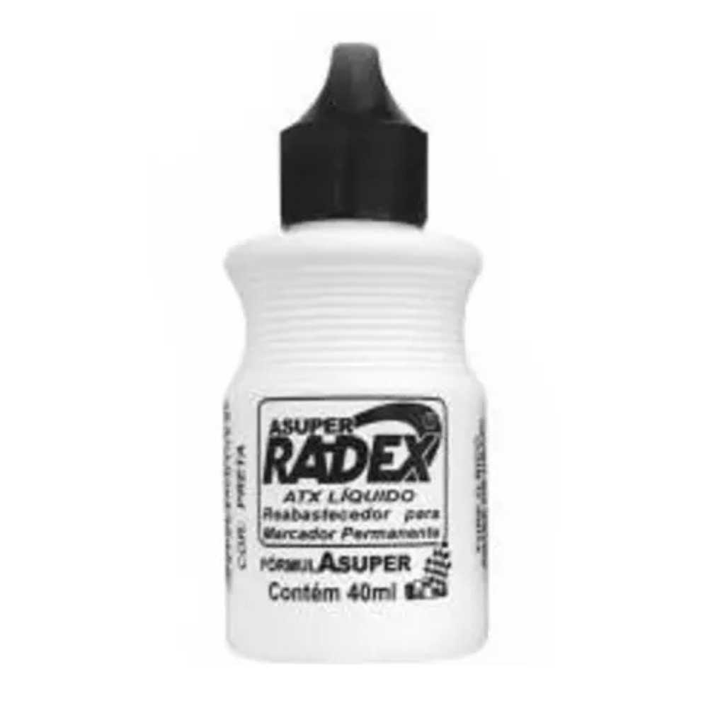 A tinta reabastecedora Asuper é indicada para reabastecer pincel marcador permanente da Radex. Em um frasco de 40 ml que garante durabilidade e eficiência no brilho.