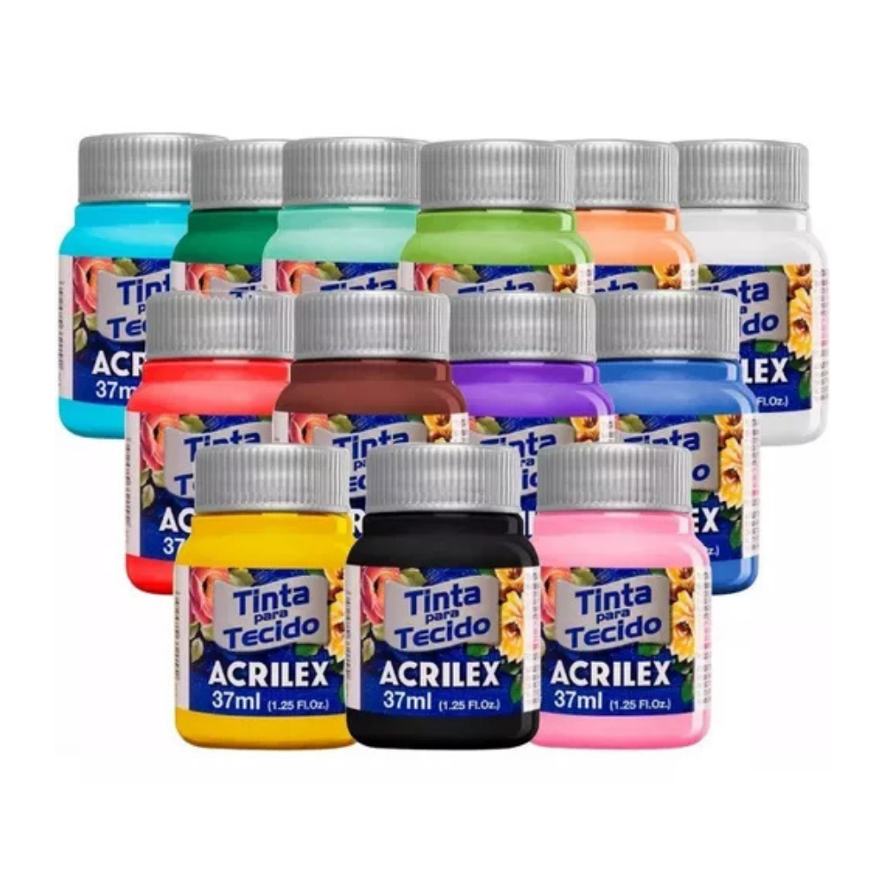 Conjunto com 12 frascos de tinta para tecido Acrilex, cada um com 37ml. As tintas possuem alta cobertura, fixação duradoura e são ideais para customização de roupas, tecidos de algodão e outros materiais têxteis.