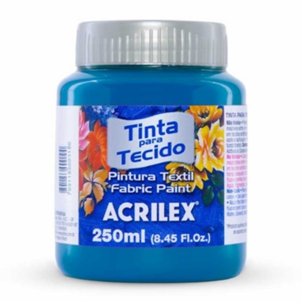 Tinta fosca para tecidos com tonalidade azul turquesa, excelente para customizações artísticas e criativas. Pode ser aplicada com pincel, esponja ou rolinho de espuma e tem secagem super rápida. É adequada também para trabalhos artesanais sobre madeira, gesso, MDF, cerâmica, cortiça, isopor, papel, palha e PET (necessário preparo prévio com Primer Acrilex).